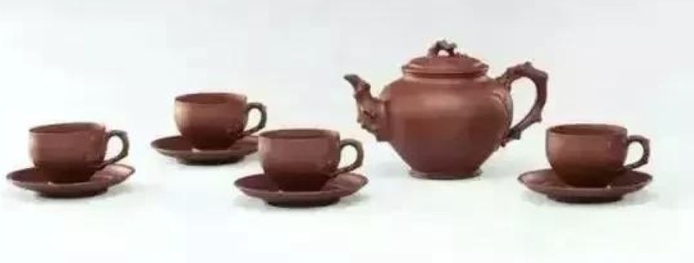 1955年,應(yīng)群眾大禮堂的定制需要,顧景舟制此套松鼠葡萄茶具,干為關(guān)于新華夏的獻(xiàn)禮。大作壺身形制偉大,壺身容積達(dá)1400cc,一壺、一糖缸、四杯、四托,總計(jì)十頭,杯碟成套,更有造型得西制之意的糖缸成為又一大亮點(diǎn)。壺、缸、杯不管造型、化妝作風(fēng)一致,創(chuàng)造出一個(gè)舒服、天然為伴的繪面,布滿了勃勃生氣。品茗之時(shí),觀賞其靜中有動(dòng),別有一番情味。
