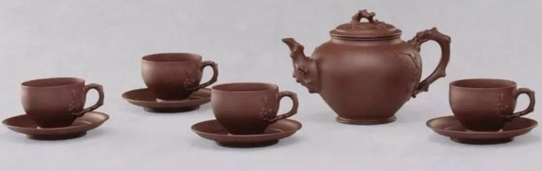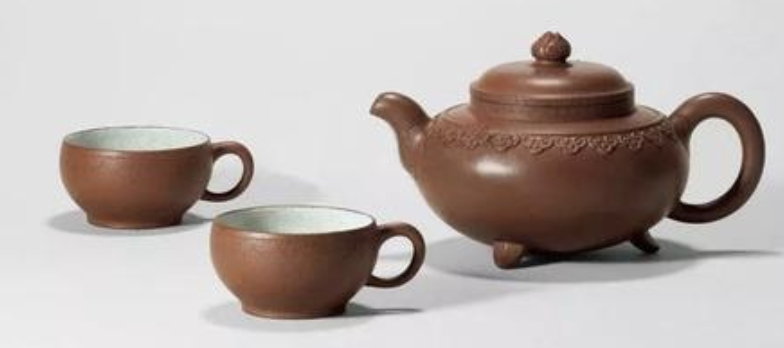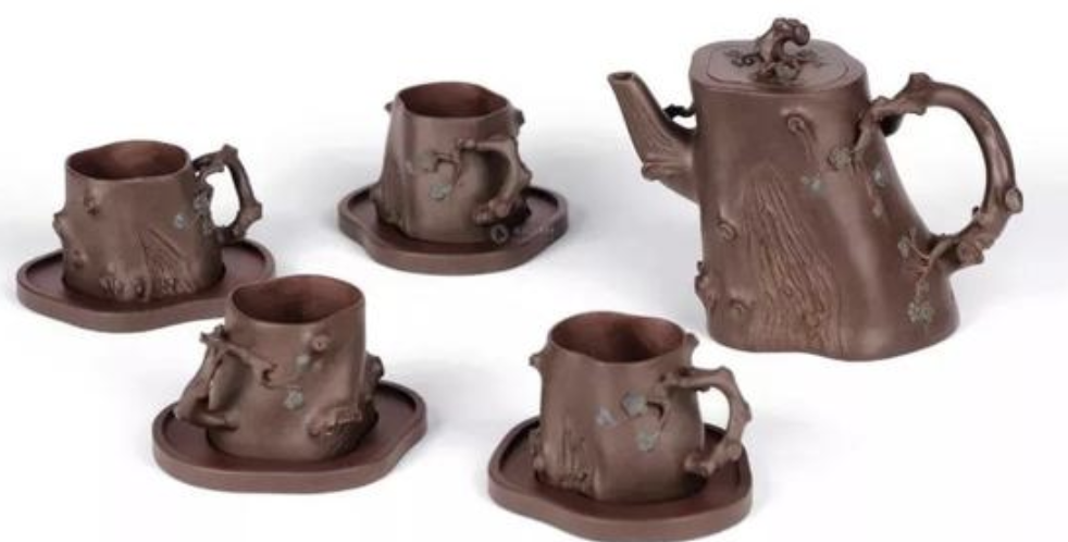 這一套茶具創造的閉頭是供春壺的身筒和杯子的身筒,由于供春壺壺身是“樹癭”,也即是大樹虬枝上的樹瘤,有凹有凸。樹癭紋路要亂而沒有散,完全效驗又央求骨血勻和、精力豐滿,藝術作風協調一致。